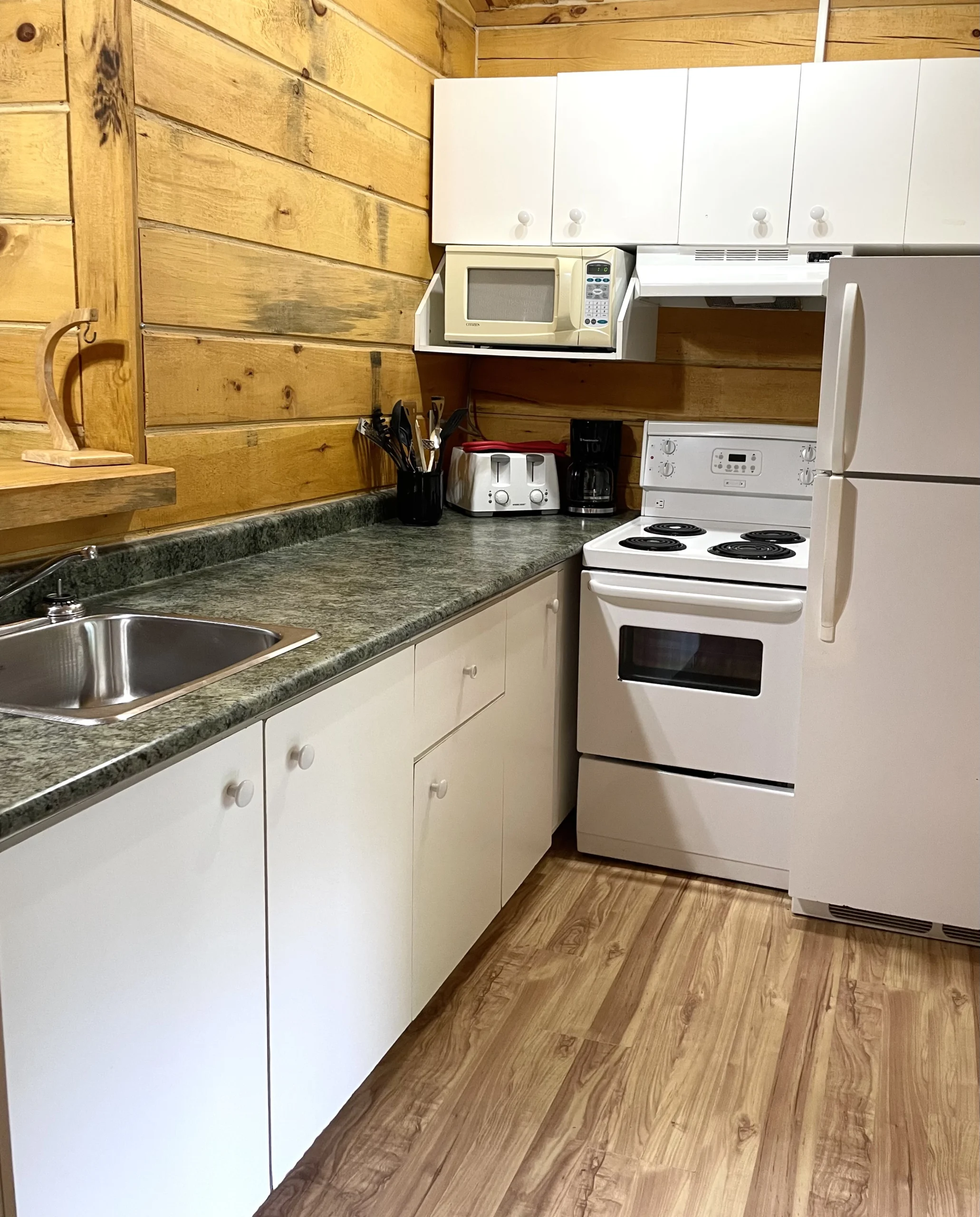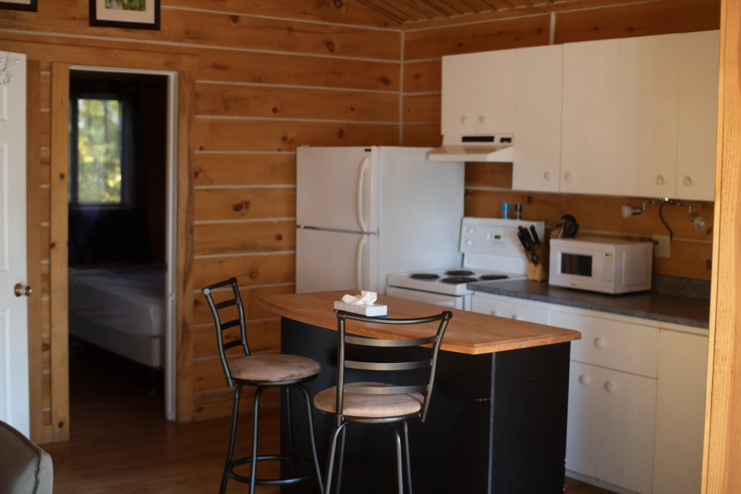 Chaque chalet comprend une cuisine entièrement équipée (couverts, casseroles et poêles inclus), une salle de bain avec douche et deux chambres confortables. Ils peuvent accueillir de 2 à 4 adultes, ou une famille composée de 2 adultes et 4 enfants.