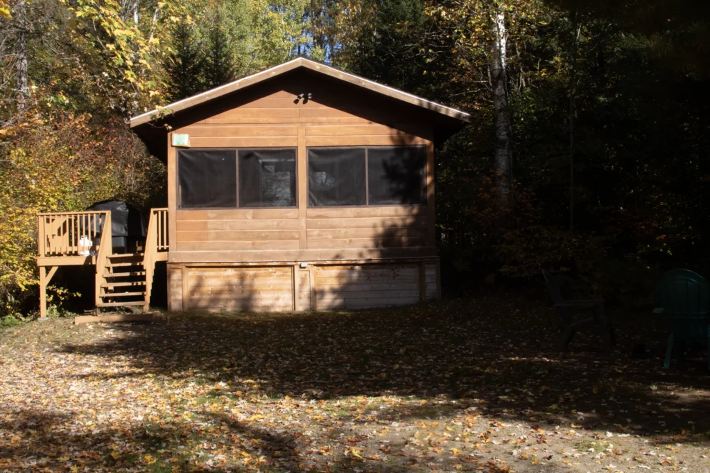 Literie non incluse. [English] A (20’ x 20’) square pine log cabins situated on the Park’s beautiful lakefront, near beach and games area. Each cabin comes with a fully equipped kitchen, a bathroom with shower, two bedrooms that can accommodate 2 to 4 adults or a family of 2 adults plus 4 children. A large screened in porch giving a spectacular view of early morning sunrises or evening sunsets. Ideal for a special romantic weekend. (Linens not included) |